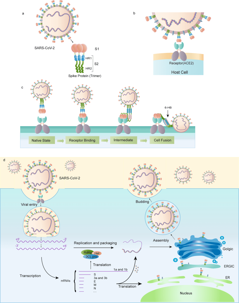 Below is the process of how the virus enters into the host cell, which in this case is humans. Schematic of the SARS-CoV-2 S protein and the mechanisms how virus enters into human cells to replicate themselves using human engines. a. The schematic structure of the S protein. b. The S protein binds to the receptor ACE2. c. The binding and virus–cell fusion process mediated by the S protein. d. The life cycle of SARS-CoV-2 in host cells. By Y. Huang et al Acta Pharmacologica Sinica (2020) 41:1141–1149; https://doi.org/10.1038/s41401-020-0485-4
