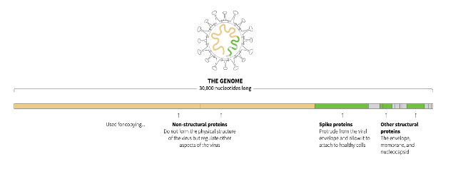 The virus’ genomic RNA is a complete set of genetic instructions that is written in 30,000 “letters” of code composed of A, T, G and C.
