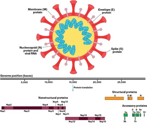The coronavirus is composed of five different components: envelope small membrane protein (E), membrane protein (N), spike glycoprotein (S), nucleoprotein (N) and genomic RNA.